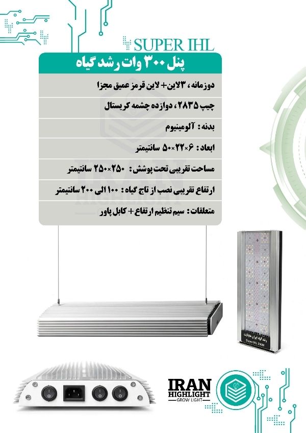 پنل رشد گیاه ۳۰۰ وات دو زمانه سه لاین دارای بکسل و ترمز برای نصب به سقف و تنظیم ارتفاع یکسال گارانتی شرکتی تضمین کیفیت